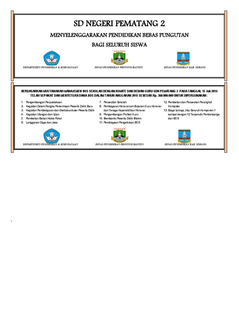 Bagi sekolah pendidikan dasar yang diselenggarakan pemerintah daerah harus sudah memasang spanduk kebijakan pendidikan bebas pungutan setiap.